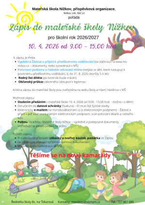 Mateřská škola Nížkov organizuje zápis dětí na školní rok 2026/2027, který proběhne 10. dubna 2026 od 9.00 do 19.00 hodin. Rodiče musí předložit vyplněnou žádost o přijetí, potvrzení o očkování, rodný list dítěte a občanský průkaz. Zápis je možné provést osobně, elektronicky nebo zasláním poštou.
