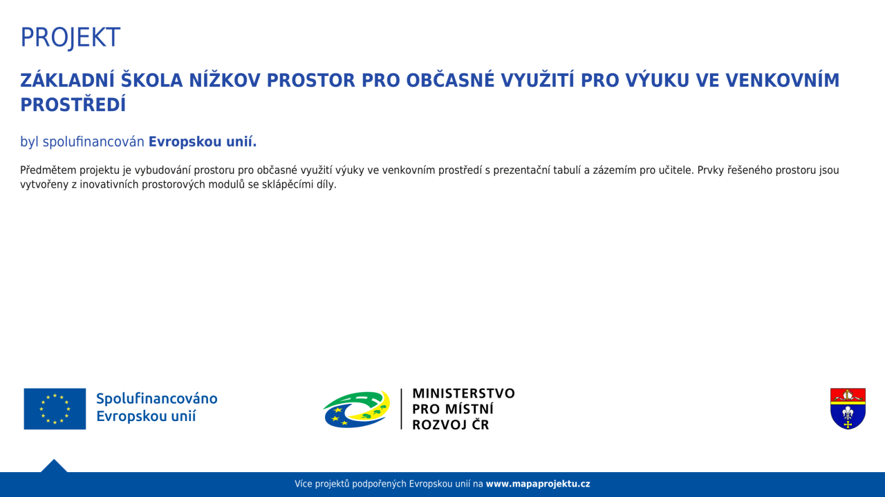Předmětem projektu je vybudování prostoru pro občasné využití výuky ve venkovním prostředí s prezentační tabulí a zázemím pro učitele. Prvky řešeného prostoru jsou vytvořeny z inovativních prostorových modulů se sklápěcími díly. Sklápěcí systém usnadňuje rychlou přeměnu učebny na volný prostor vhodný pro pohybové aktivity, snadné zazimování bez nutnosti přenášení nábytku a prodlužuje životnost produktu.